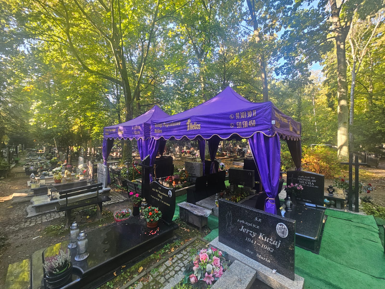 Podczas pochówku na cmentarzu zakład przygotował specjalny namiot pogrzebowy, który chroni najbliższą Rodzinę przed deszczem lub słońcem.